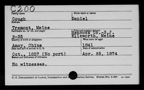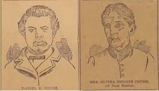 1857年,17岁的中国人Daniel Cough (1840–1905) 从厦门藏身美国贸易帆船登上缅因州。他落户的地方就是今天的Arcadia国家公园。Daniel Cough后来他娶了一名当地孤儿Elvira Higgins并加入了美国籍。【1】1897-1898年缅因州几家报纸大幅刊登57岁的Daniel Cough被妻子告上法院要求离婚,因为丈夫常年不许她出家门。Daniel Cough的儿子Arno还因为保护母亲与父亲动手而被监禁。该媒体报道中有这样一张夫妇俩素描: