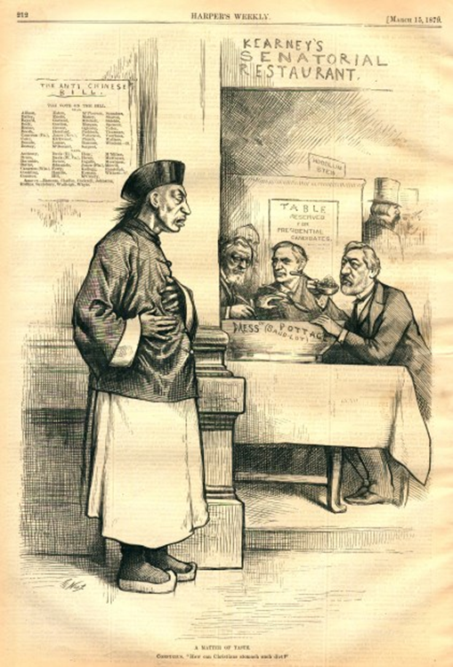 一位署名Bailey的作者,在文章中描绘了他眼中的“中国人”形象——“神情愚钝而天真,脸瘦、眼睛细长,留着长辫子,穿着木屐。”他反对华人移民,主要是出于经济原因:因为华人愿意接受比白人劳工低得多的工资。因此,华工在制鞋、制衣、雪茄生产和洗衣等行业中占据了重要地位。