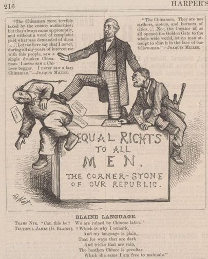 以下这张杂志上的漫画Harper’s,揭露了布莱恩利用华工没有选举权,就对华工竭尽百般污蔑以达到讨好工会赢得选票的目的,华人手里散落的纸片上写着:没有选票,爱尔兰工人手里写着:选票。最有讽刺的是三人所在基石上刻着:“人人平等是美国立国之本”。