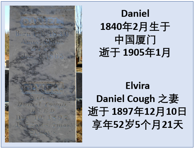 结婚27年后,52岁的Elvira去法院要求与Daniel Cough离婚。理由是丈夫常年不让自己与外界接触。然而离婚官司还没打下来,Elvira就因肺结核病逝。目前的墓碑刻着两人的名字生卒日期。妻子病逝8年后,也就是1905年1月,这位缅因州第一个华人Daniel Cough孤身死在家中,享年64岁。