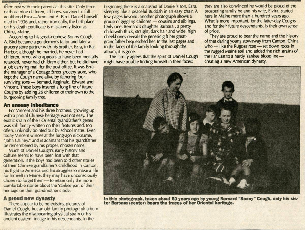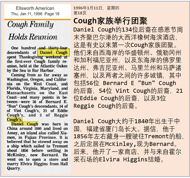 Daniel Cough去世90年后,1996年1月11日,缅因州 “Ellsworth美国人”报纸在第18页刊登了Cough家族聚会的新闻,详细介绍Cough大家族: