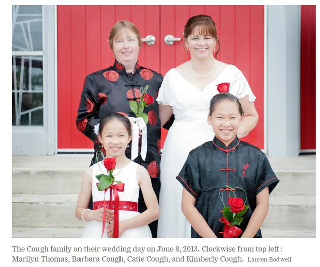 那次团聚的17年后,2013年6月,Daniel Cough 后人Barbara Cough 举行婚礼,她和新郎从中国领养的2个女孩合影:
